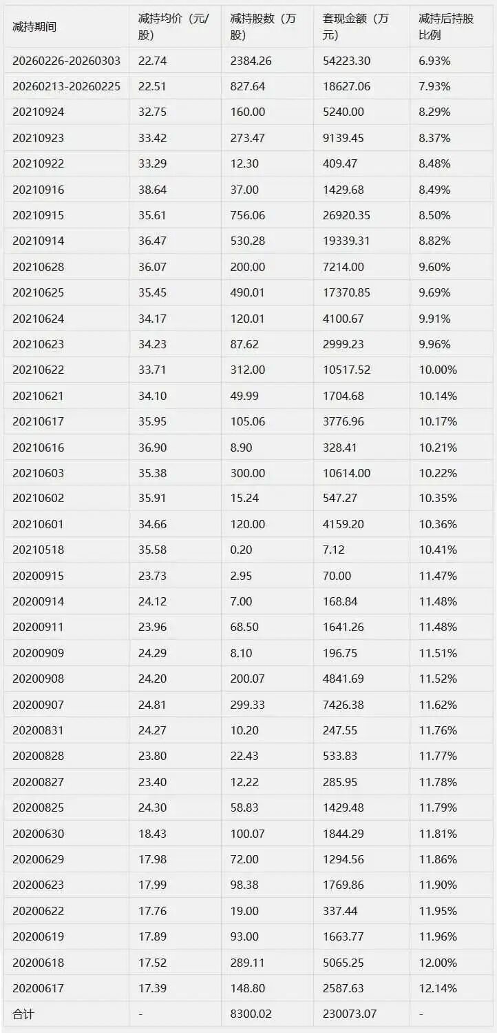 到了2026年初,他在2月13日至3月3日的七个交易日内,连续两轮减持3212万股,占公司总股本的1.35%,按照区间平均股价测算,套现约7.28亿元。