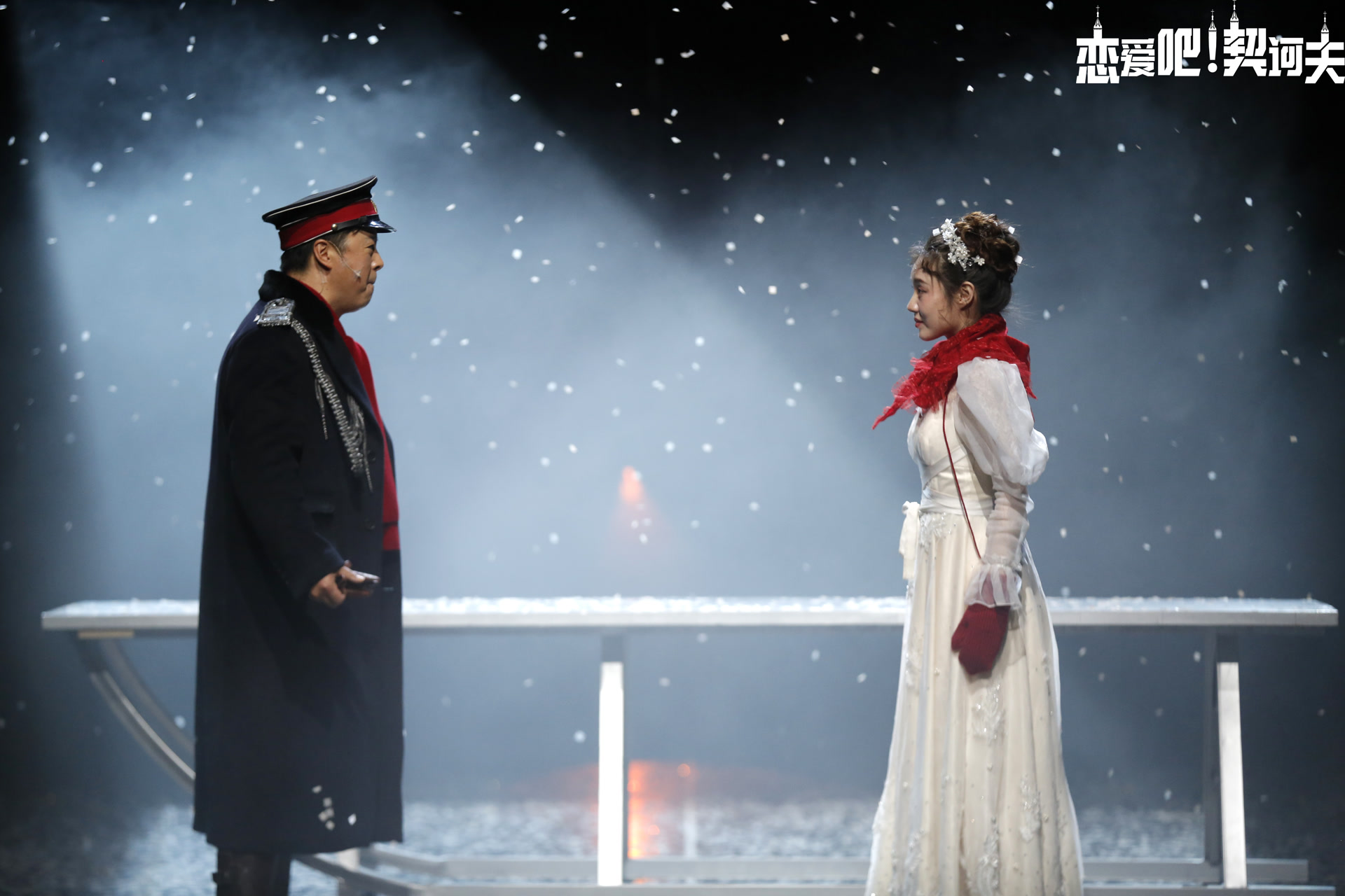《恋爱吧!契诃夫》的舞台被巧妙分割为不同演区,如同一座“爱情万花筒”——观众仿佛拥有了上帝视角,同时见证爱情的不同状态:是《蠢熊》中从敌视到猝不及防坠入爱河的悸动;是《求婚》里争吵不休却被爱情征服的啼笑皆非;也是《婚礼》中对“金钱至上”婚恋观的荒诞讽刺。这种“交响乐式”的叙事结构,让三个爱情乐章在同一空间同时奏响。正如开场的“读者”向观众抛出的问题:“爱情究竟是什么?”答案不在单一故事里,而在三者的对话与交织中浮现。